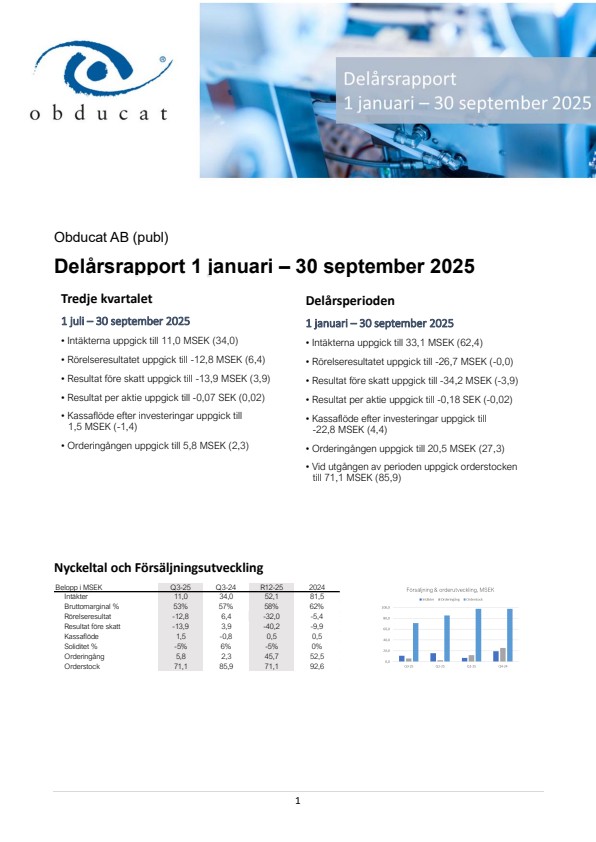 Styrelsen fattade beslut den 7 november att kalla till extra bolagsstämma för beslut om att genomföra en företrädesemission av högst 155 116 295 units, med företrädesrätt för befintliga aktieägare i Bolaget, förutsatt godkännande vid en extra bolagsstämma som planeras att hållas den 10 december 2025. Förutsatt att Företrädesemissionen fulltecknas tillförs Bolaget initialt cirka 49,6 MSEK, före avdrag för emissionskostnader. Genom vidhängande teckningsoptioner av kan Bolaget under november 2026 komma att tillföras ytterligare högst cirka 27,9 MSEK, före avdrag för emissionskostnader. Teckningskursen i Företrädesemissionen har fastställts till 0,32 SEK per unit, vilket motsvarar 0,08 SEK per aktie. Totalt omfattas Företrädesemissionen av avsiktsförklaringar, teckningsförbindelser och garantiåtaganden upp till cirka 75 procent av emissionsvolymen (motsvarande totalt cirka 37,2 MSEK). Nettokapitaltillskottet från Företrädesemissionen och Teckningsoptionerna ska sammantaget stärka balansräkningen, säkerställa erforderligt rörelsekapital och skapa förutsättningar för en återhämtning fram till hållbar lönsamhet från och med 2026. För att säkerställa Bolagets operativa likviditetsbehov fram till att Företrädesemissionen har genomförts har Bolaget ingått ett avtal om brygglån motsvarande 12 MSEK. Utöver Brygglånet har Obducat ingått avtal om lånefinansiering motsvarande cirka 5 MSEK i syfte att återbetala den återstående delen av utestående konvertibelt lån till Fenja Capital som delvis även avses återbetalas genom likvid från Företrädesemissionen, varefter lånet är till fullo återbetalt. För mer detaljerad information, vänligen se Bolagets pressmeddelanden den 7 november 2025.