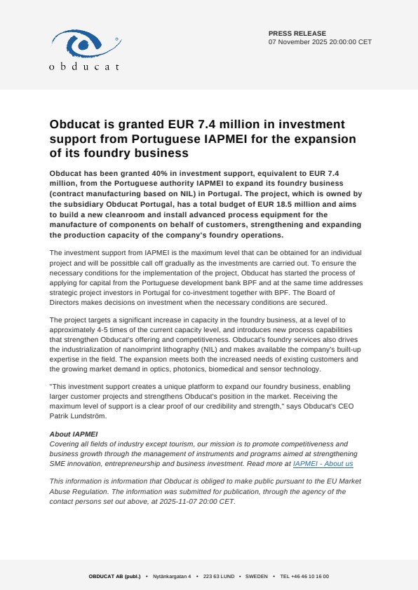 Obducat has been granted 40% in investment support, equivalent to EUR 7.4 million, from the Portuguese authority IAPMEI to expand its foundry business (contract manufacturing based on NIL) in Portugal. The project, which is owned by the subsidiary Obducat Portugal, has a total budget of EUR 18.5 million and aims to build a new cleanroom and install advanced process equipment for the manufacture of components on behalf of customers, strengthening and expanding the production capacity of the company's foundry operations.