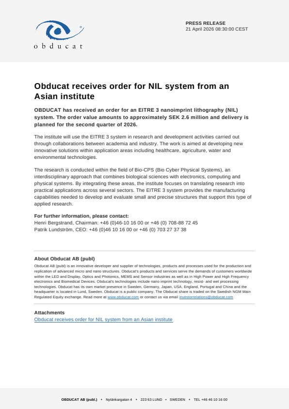 OBDUCAT has received an order for an EITRE 3 nanoimprint lithography (NIL) system. The order value amounts to approximately SEK 2.6 million and delivery is planned for the second quarter of 2026.