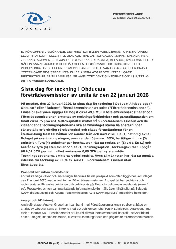 På torsdag, den 22 januari 2026, är sista dag för teckning i Obducat Aktiebolags (”Obducat” eller ”Bolaget”) företrädesemission av units (”Företrädesemissionen”). Emissionsvolymen uppgår till högst cirka 49,6 MSEK före emissionskostnader och Företrädesemissionen omfattas av teckningsförbindelser och garantiåtaganden om totalt cirka 75 procent. Nettokapitaltillskottet från Företrädesemissionen och de vidhängande teckningsoptionerna ska sammantaget stärka balansräkningen, säkerställa erforderligt rörelsekapital och skapa förutsättningar för en återhämtning fram till hållbar lönsamhet från och med 2026. En (1) befintlig aktie i Bolaget på avstämningsdagen, som var den 5 januari 2026, berättigar till tre (3) uniträtter. Fyra (4) uniträtter ger innehavaren rätt att teckna en (1) unit. En (1) unit består av fyra (4) stamaktier och en (1) teckningsoption. Teckningskursen uppgår till 0,32 SEK per unit, vilket motsvarar 0,08 SEK per ny stamaktie. Teckningsoptionerna emitteras vederlagsfritt. Även allmänheten har rätt att anmäla intresse för teckning av units av serie B i Företrädesemissionen utan företrädesrätt.